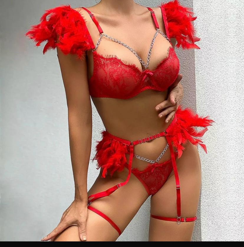 Şıklığı ve zarafeti bir araya getiren Kırmızı Gold ve Tüy Detaylı Jartiyer Takım, özel anlarınızı unutulmaz kılmak için tasarlandı. Bu eşsiz set, hem göz alıcı görünümü hem de konforlu yapısıyla her kadının gardırobunda olması gereken bir parça.